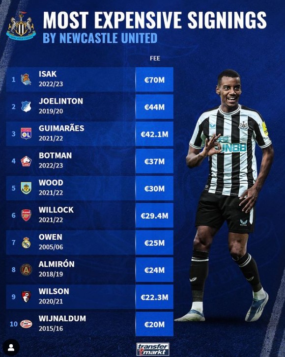 纽卡队史最贵引援:伊萨克7000万欧第一,乔林顿第二
