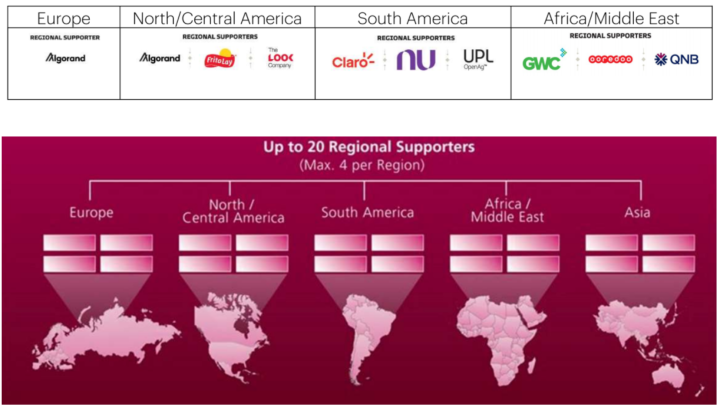 地区支持者共有20家公司席位,每个地区最多有4家公司,他们获得与特定地区的锦标赛相关的广告、推广和营销权。五个预定义区域是欧洲、北美洲/中美洲、南美洲、非洲/中东(包括卡塔尔)和亚洲。