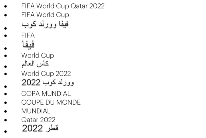 国际足联已经开发了一系列品牌资产,包括与赛事和国际足联有关的标志、文字、标题、符号和其他标识符(“官方知识产权”)。官方知识产权在卡塔尔和世界各地受到版权,商标和/或其他形式的知识产权和法律的保护。