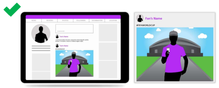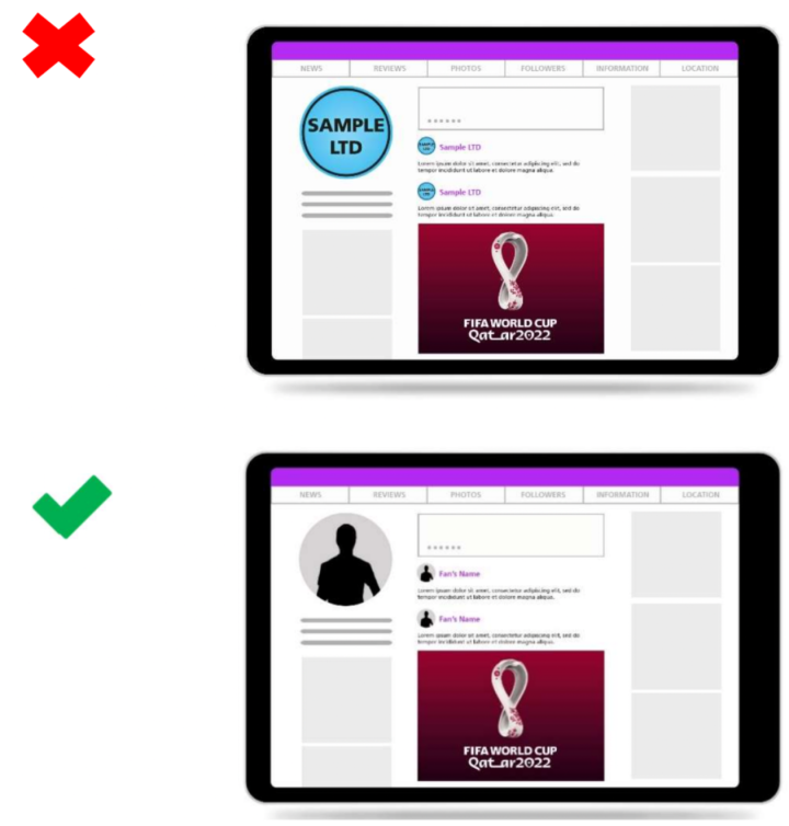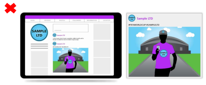 带有商业利益的(公司)简介在标签中使用官方知识产权,以吸引对其简介和/或其他企业或品牌的关注,从而与赛事和/或国际足联产生商业关联,因此这仅限于国际足联和国际足联版权持有人。