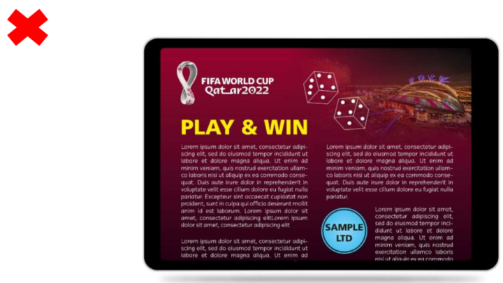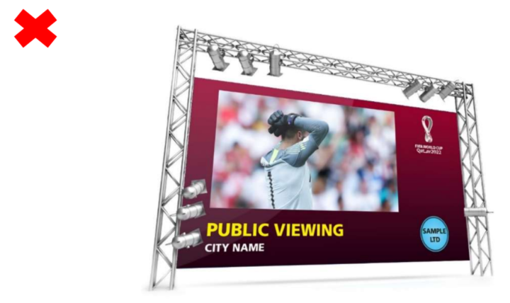 任何其他显示比赛动态图像的公共观赛活动应避免使用任何官方知识产权或广告赞助,以免在国际足联和/或比赛与非国际足联权利持有人的第三方之间建立未经授权的联系。