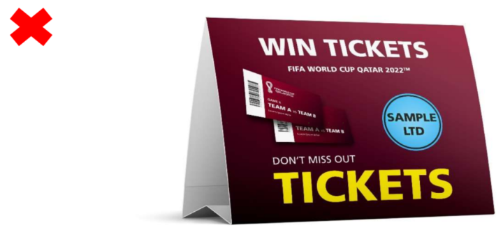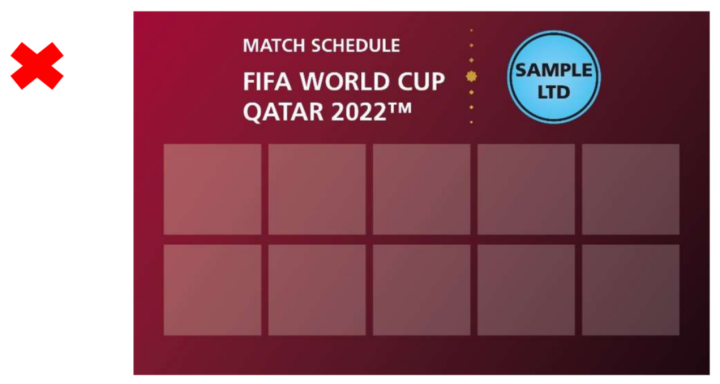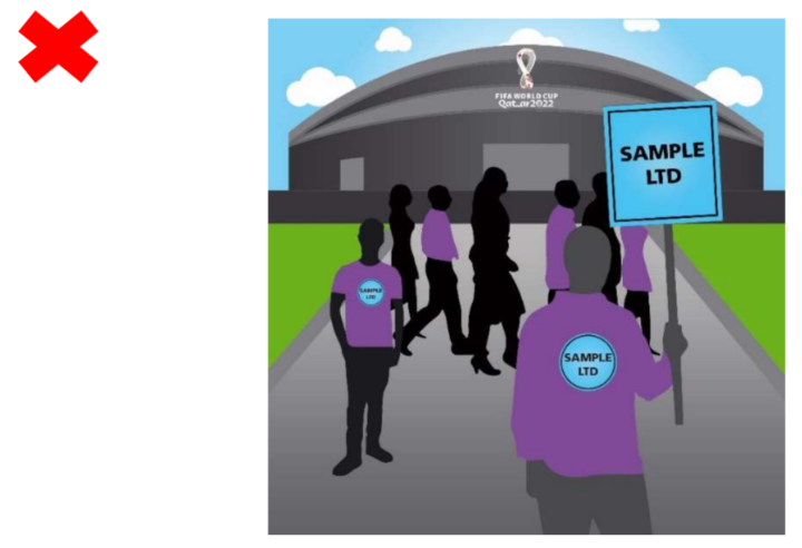球迷团体,包括款待客人团体,不得展示或佩戴带有相同非国际足联品牌的物品,包括引导团体进入体育场的标志,这会造成未经授权的关联,并违反票务条款和条件。这包括品牌服装、旗帜或送给球迷的任何其他物品。
