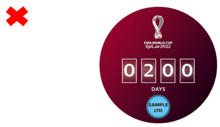 然而,官方知识产权不能用作出版物布局的组成部分、出版物品牌的要素或单独使用,以静态方式或在网站上重复使用(特别是在特别版的角落,或在网站的特别位置的每个连续网页上重复使用官方知识产权,因为这种使用可能意味着国际足联的官方授权)。