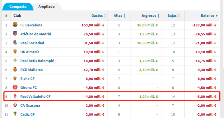 为了能够保级,巴拉多利德与其他两个升班马一样,在夏窗都投入了真金白银,虽然比不上阿尔梅里亚豪掷1910万欧的大气,精明商人的罗纳尔多这个夏天依然净投入了380万,位列西甲俱乐部净投入榜第9的位置。罗纳尔多花的这些钱,主要用在买断贡萨洛-普拉塔和蒙楚(巴萨拉玛西亚出品球员)等人身上,免签了原塞维利亚后卫埃斯库德罗等人,保证了冲甲整体阵容,又做了些许补充,大罗的商业头脑的确精明。这不,客场对阵塞维利亚的比赛,要不是裁判的手下留情(一个点球未判),巴拉多利德差点拿下新赛季西甲的首场胜利。