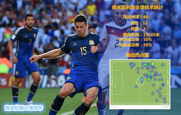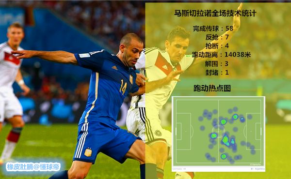 而马斯切拉诺在防守时,位置比较灵活,通过其丰富的经验与预判,不断无球跑动,极大地限制了德国队的接球点,一度使得德国队在中场无法完成传递。小马哥不仅在防守端有着出色的发挥,同时也承担着阿根廷发起反击的组织重任。比赛中,阿根廷队的反击多数是由马斯切拉诺完成向前的一脚传递。