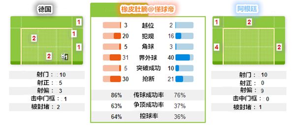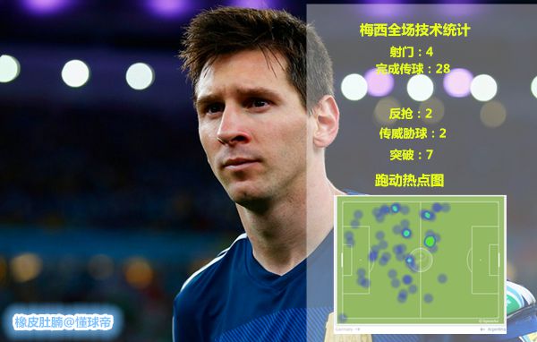 立足防守的阿根廷,在本场比赛中曾多次给德国队制造威胁。其中就有伊瓜因与帕拉西奥错失的绝佳机会,但阿根廷的进攻核心,毫无疑问是梅西。梅西在这场比赛中,又是一人扮演着多重角色,组织进攻,传威胁球,完成射门直至比赛进行到第116分钟,德国队还依然派出4人对梅西进行围抢。而全场比赛中,梅西最好的一次机会则出现在下半场开始,梅西接后场直塞球,反越位成功,可惜面对诺伊尔时,射门偏出。缺少了迪马利亚,梅西似乎显得有些独木难支。