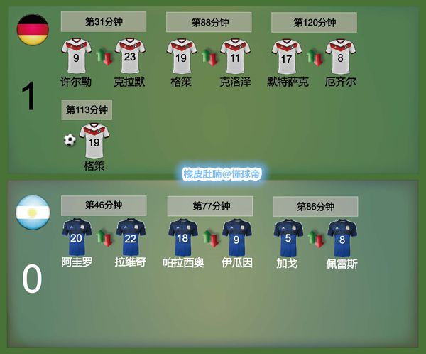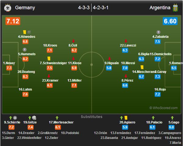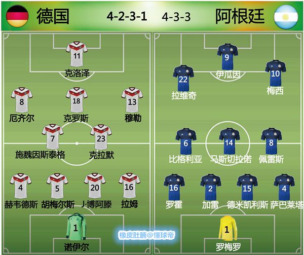 德国(4231):1-诺伊尔/16-拉姆、20-博阿滕、5-胡梅尔斯、4-赫韦德斯/23-克拉默(31’9-许尔勒)、7-施魏因斯泰格/8-厄齐尔(120’17-默特萨克)、18-克罗斯、13-穆勒/11-克洛泽(88’19-格策)