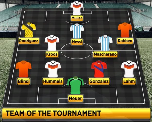 诺伊尔(德国)/拉姆(德国),冈萨雷斯(哥斯达黎加),胡梅尔斯(德国),布林德(荷兰)/马斯切拉诺(阿根廷),托尼-克罗斯(德国)/罗本(荷兰),梅西(阿根廷),J-罗德里格斯(哥伦比亚)/穆勒(德国)