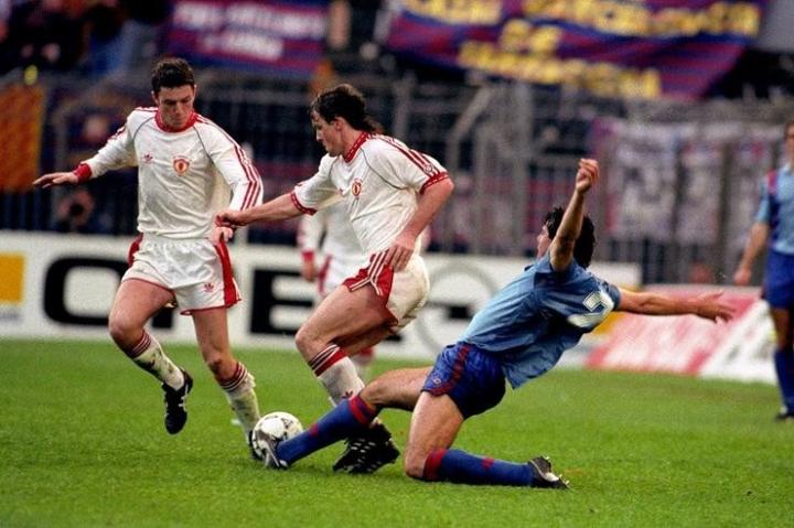 (图)在1991年欧洲优胜者杯决赛中,南多铲截曼联球员马克-休斯