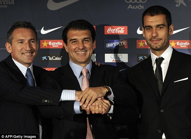 (图)瓜迪奥拉入主巴萨时,贝吉里斯坦(左)、拉波尔塔与瓜帅的合照