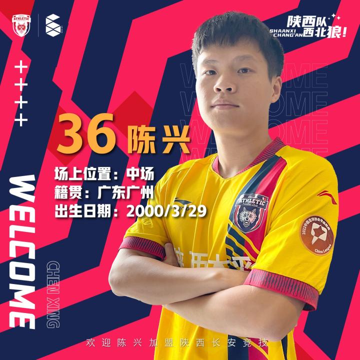 陈兴,2000年3月9日出生于广东。身高178厘米,场上主要担任中场,也可胜任左右边前卫,是2022赛季U23政策适龄球员。本赛季已经在联赛中代表陕西队有过出场。