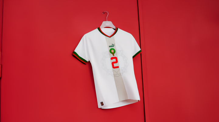 全新摩洛哥国家队客场球衣将球队队徽置于球衣中央,前胸的圆形图案则取自于摩洛哥传统马赛克色调图形,风格独特,引人注目。