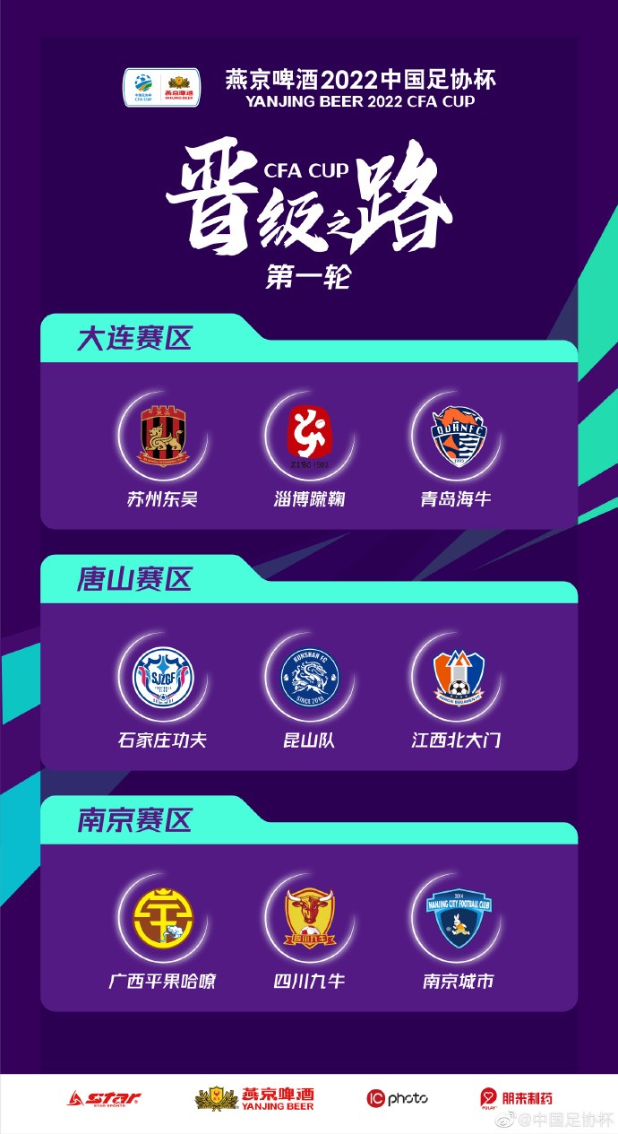 在此前进行的中国足协杯第一轮赛事中,苏州东吴、淄博蹴鞠、青岛海牛、石家庄功夫、昆山、江西北大门、广西平果哈嘹、四川九牛、南京城市已经晋级第2轮。第2轮对阵抽签将于9月5日中午11点30分进行。
