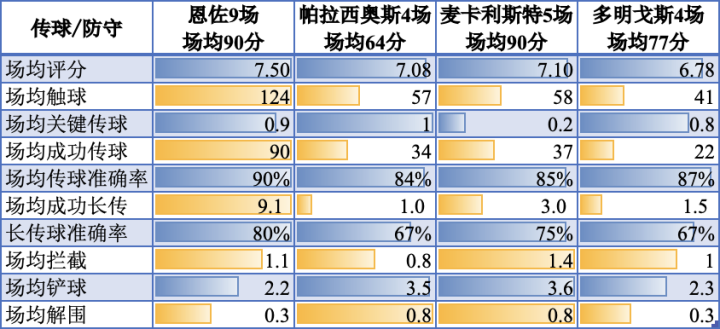 多明戈斯是四人之中在新赛季表现较差的,他也不如帕拉西奥斯那么全面,大概率他是要被舍弃的。帕拉西奥斯和麦卡利斯特在传球和防守数据方面相差不多,帕拉西奥斯是全能中场,可以胜任多个位置,且为阿根廷比赛的经验最为丰富,个人认为他是4人之中最有可能去卡塔尔的。而麦卡和恩佐,就要看9月的表现了。