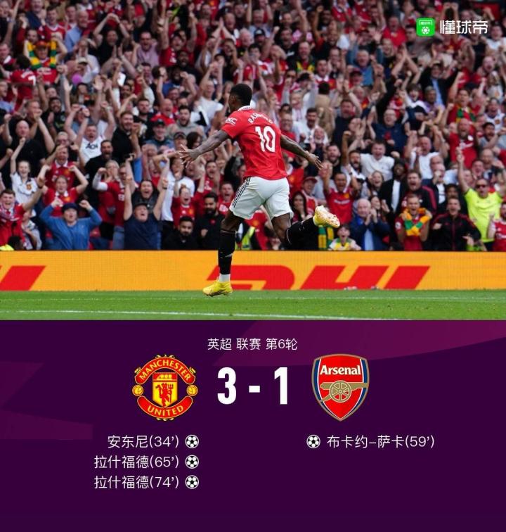 曼联3-1送阿森纳首败,拉什福德两射一传,安东尼首秀即破门