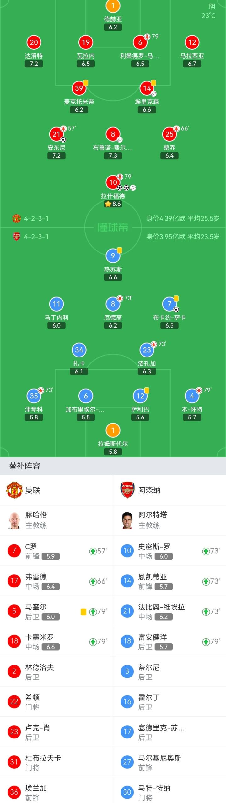 曼联首发:1-德赫亚、12-马拉西亚、19-瓦拉内、6-利桑德罗-马丁内斯(79'5-马奎尔)、20-达洛特、39-麦克托米奈、14-埃里克森、8-布鲁诺-费尔南德斯、25-桑乔(66'17-弗雷德)、21-安东尼(57'7-C罗)、10-拉什福德(79'18-卡塞米罗)