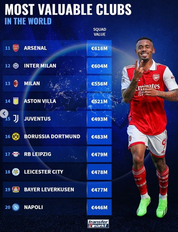 11.阿森纳:6.16亿