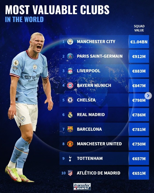 俱乐部总身价排名:曼城超10亿欧第一,巴黎第二,利物浦第三