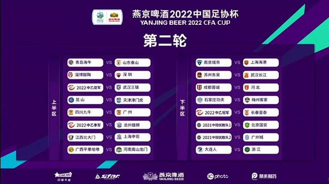 今年8月底,2022年足协杯打响。目前,32强的名额配额分别是9支经过淘汰赛上来的中甲球队,加上18支中超球队,以及3支中乙球队、2支中冠球队。在下半区的8场1/16决赛中,除长春亚泰客场对阵2022年中乙冠军,其他7场较量为南京城市对阵上海海港、苏州东吴对阵武汉长江、成都蓉城对阵河北队、石家庄功夫对阵梅州客家、2021中冠优胜队1对阵北京国安、2021中冠优胜队2对阵广州城、大连人对阵浙江队。