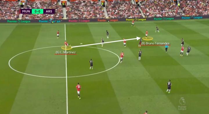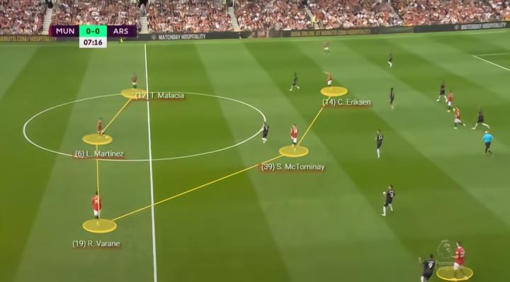 4.利桑德罗-马丁内斯前顶,承担一部分出球任务,瓦拉内补位居多。