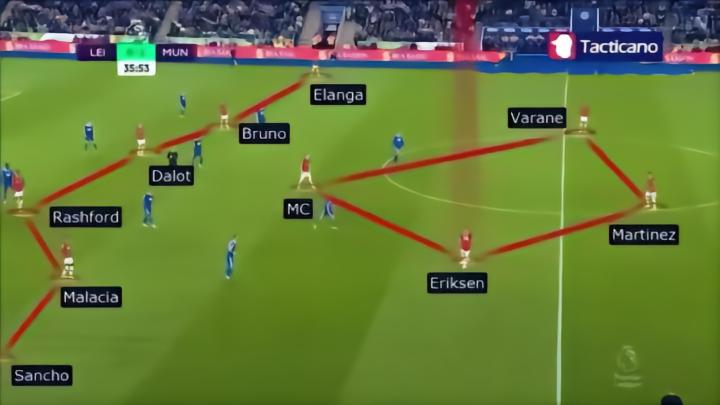 拉什福德突前,伺机利用速度冲击防线,桑乔和埃兰加在侧翼能上能下,在防守时退回防守三区,填补肋部的空当。埃里克森承接中后场的衔接工作,而提供对抗和硬度的麦克托米奈则在埃里克森身边为后者保驾护航。