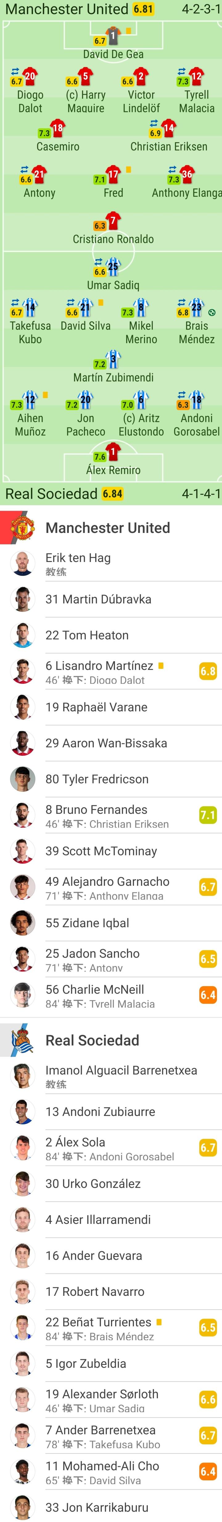 曼联首发:1-德赫亚、20-达洛特(46'6-利桑德罗-马丁内斯)、2-林德洛夫、5-马奎尔、12-马拉西亚(83'56-查理-麦克尼尔)、18-卡塞米罗、17-弗雷德、14-埃里克森(46'8-布鲁诺-费尔南德斯)、36-埃兰加(70'49-加纳乔)、21-安东尼(70'25-桑乔)、7-C罗