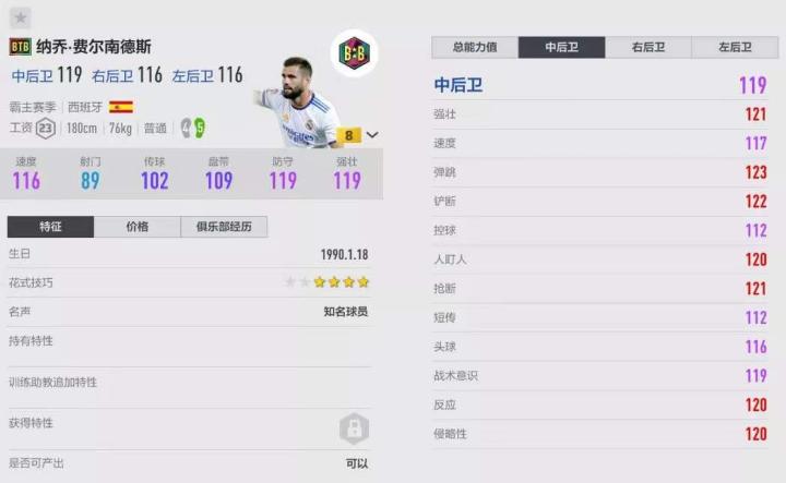 BTB纳乔在顶级中卫扎堆的皇马套里,很难竞争首发,但是考虑性价比,这张卡还是值得平民玩家入手的,在瓦拉内等球员状态不好时,可以顶上来。