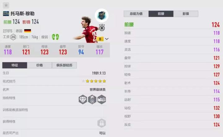 22TS穆勒射门很准,大力DD发力足,低射的手感和精度都没问题;穆勒有着很好的门前嗅觉,经常能插上抢点和跟进推射/补射,“捡漏”能力不俗;穆勒的空位冲顶头球不错,但是原地争顶容易发不上力量,传中时要给他留一个抢点的时间。22TS穆勒的整体节奏和速率偏慢,适合传控和撕扯打法,能作为前腰、边前卫甚至前锋来用,是强度很可观的前场“多面手”。