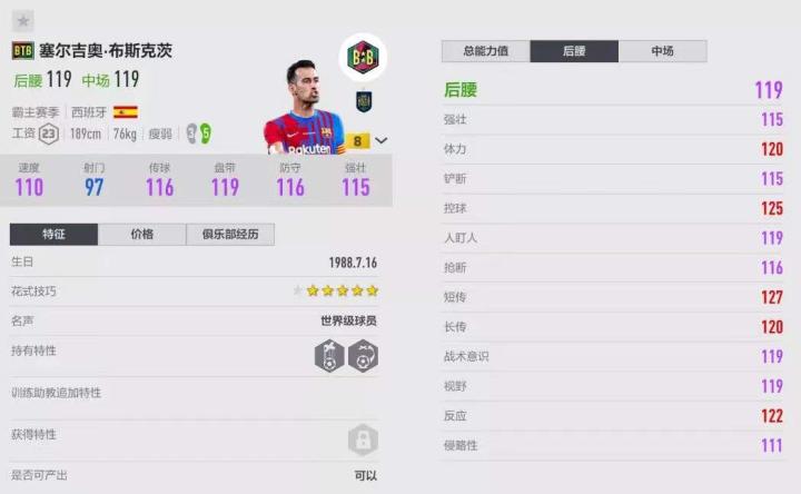 布教授的体型较瘦,他第一下身体接触还可以,但是对抗中的持续卡位不太稳定,碰到一些“不倒翁”型前锋,容易被抹过身位。BTB布斯克茨是一名兼顾防守和出球的后腰,插上进攻不是强项,战术作用比较明确,在传控打法里效果更好。考虑信仰和后腰位置人选,巴萨套和西班牙套的玩家,不妨适当考虑备一张BTB布斯克茨,以更好地应对轮换需要。