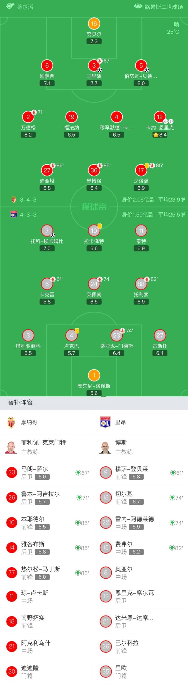 摩纳哥首发:16-努贝尔、5-伯努瓦-巴迪亚西勒、3-马里潘、6-迪萨西、12-卡约-恩里克、4-穆罕默德-卡马拉、19-福法纳、2-万德松、17-戈洛温、36-恩博洛、27-迪亚塔