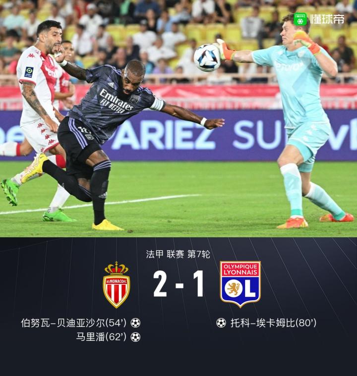 北京时间9月12日2:45,法甲第7轮,摩纳哥主场对阵里昂。上半场,迪亚塔推射击中立柱,拉卡泽特抽射被门将没收,泰特推射打偏。下半场,伯努瓦-巴迪亚西勒、马里潘头球破门,托科-埃卡姆比扳回一分,最终,摩纳哥2-1里昂。