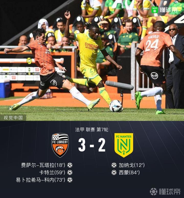 北京时间9月11日21:00,法甲第7轮比赛,洛里昂主场对阵南特。上半场,加纳戈头槌打破僵局,瓦塔拉直接任意球扳平比分,随后加纳戈再次破门但越位无效;下半场,卡特兰完成洛里昂首秀并取得破门,科内挑射再下一城,西蒙破门,最终洛里昂3-2战胜南特。