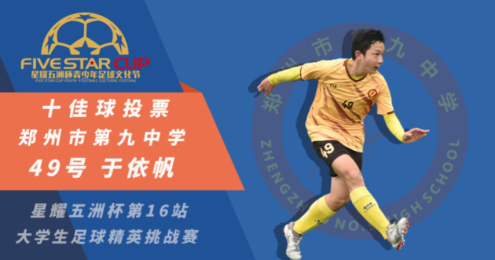 郑州九中49号于依帆入选“耀·星耀五洲杯”第16站大学生足球精英挑战赛高中组十佳球。