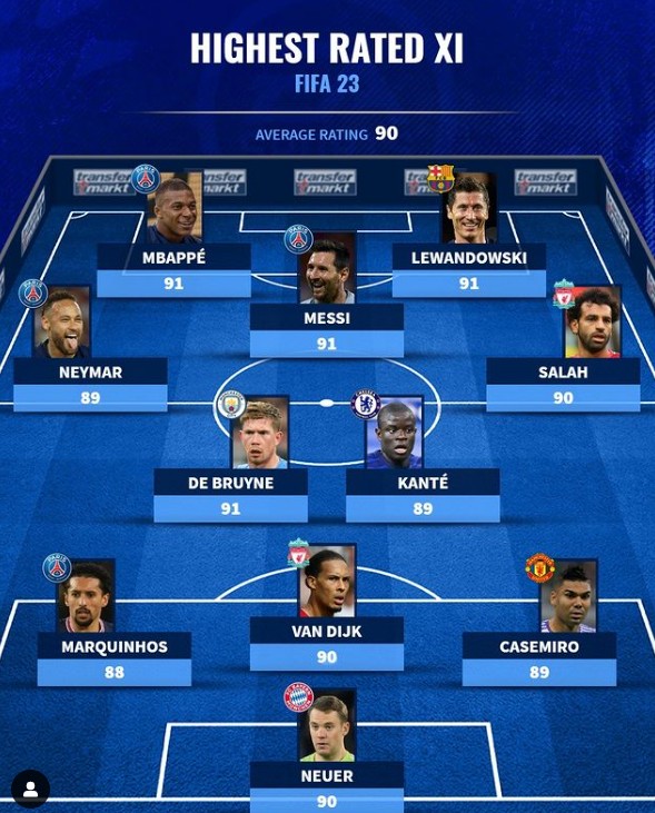 FIFA23公布了最新的球员数值,其中莱万和梅西等多名球员的数值达到91。德国知名足球数据网站“转会市场”根据球员在FIFA23的最新能力值,排出了能力值最高的阵容。莱万、梅西和姆巴佩领衔攻击线。在这套阵容中,曼联新援卡塞米罗被排在了右中卫的位置上。