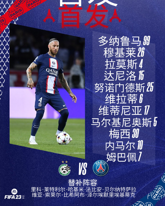 我们的首发阵容为:多纳鲁马,穆杰莱,拉莫斯,达尼洛-佩雷拉,努诺门德斯,维拉蒂,维蒂尼亚,马尔基尼奥斯,梅西,内马尔,姆巴佩。