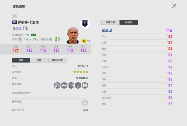 作为边后卫,可能玩家们比较担心他的身高问题,不过从实战情况来说,他的身体对抗丝毫不逊色于那些大个子边路球员,重心极低的他还有着健硕模型,强壮属性也不错,所以抢断后的护球非常稳定,不过玩家们要注意不要让中卫失位,给对手下底传中的机会,那样的话卡洛斯可能会直接面对高大的中锋,防守成功率就较低了。