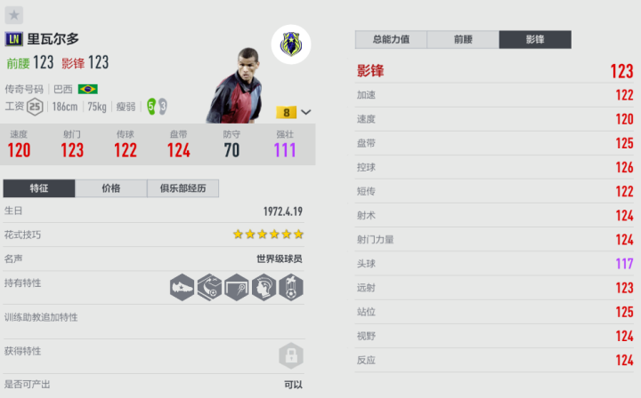 里瓦尔多是经典“巴西3R”组合之一,2002年随巴西一同捧起世界杯,在其中扮演了关键角色;2003年,里瓦尔多加盟米兰的第一年,就圆梦欧冠。1999年,里瓦尔多成为金球奖和世界足球先生的双料得主,他的个人荣誉达到巅峰。很多玩家在用MC和BTB瓦刀,他们的逆足都是2,而LN终于加强成为3逆。以往赛季,由于右脚的处理球精度有限,只能做简单的安全传球,主要的射门和传球手段,都要用左脚完成,这样的弊端是对方容易针对。而LN的右脚准确率提高,也能送出一些好传,或者尝试高难度射门,瓦刀仿佛“卸下了一层枷锁”。LN里瓦尔多的传中球弧度高、力度大,很容易绕开防守球员,后点包抄的球员更有机会接到;瓦刀的搓射射程远,在大禁区角都可以来一下,往往有奇效。LN里瓦尔多的功能性不错,在对应的套装里,有机会成为重要边锋人选,后续可以补充进来。