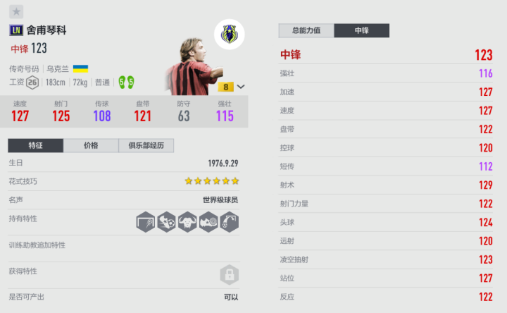 “乌克兰核弹头”舍甫琴科能突擅射,是锋线上的绝对核心。2003年,他帮助AC米兰夺得欧冠冠军;2004年,舍瓦荣获金球奖,他在圣西罗迎来了职业生涯的巅峰。身背“7号球衣”,舍甫琴科给米兰城谱写了,专属于“7”的华丽乐章。LN是舍甫琴科的第一张55脚赛季,逆足的加强让舍瓦的作用更大,特性还新增了“善于头球”,宣告那个无所不能的“锋线杀手”回归!舍甫琴科的速度非常快,后卫稍不注意就容易被甩开身位,单凭启动优势,舍瓦就有极大威胁。来到进攻三区后,新舍瓦的威力得以显现,接球后能更多角度的尝试打门,可以用左脚做更多处理。比如从中路向左侧斜插接到直塞,舍瓦能顺势左脚大力DD,精度比CAP赛季更高。很多玩家用CAP舍瓦应该有体会,他的头球能力不弱,而新增了“强头”后,LN赛季也经常在传中打法里建功,上演高高跃起头槌的好戏。LN舍甫琴科是版本新增的强力双五脚前锋,让AC米兰、切尔西这些队套,锋线再进强援,大家不妨体验一下“白大罗”的感觉。