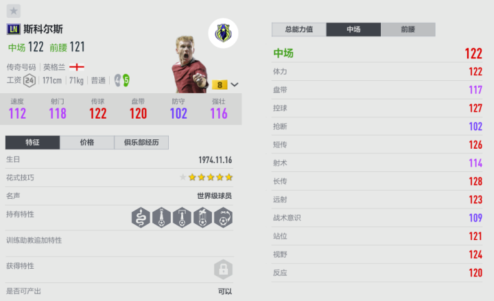 “生姜头”斯科尔斯有很长的职业生涯,他是“红魔”一人一城的代表人物、“92黄金一代”的中场大脑。斯科尔斯随曼联夺得两次欧冠、11次联赛和多项杯赛冠军,是当之无愧的中场传奇。LN是斯科尔斯唯一的45脚赛季,在和其他赛季比较中,这一点让LN基本处在不败之地。LN斯科尔斯能打前腰,还可以拉回来做组织中场。他的传球很犀利,具有穿透性和想象力,赶上左脚也能一脚传球和直塞,精度有明显提升。斯科尔斯具有插上大力轰门的特点,由于他的速度不快,很难第一时间前插,所以一般是用来二次射门或跟进补射,“捡漏”的意识挺不错。斯科尔斯的对抗不稳定,体型影响他不适合长时间黏球,要多及时分球转移。加强后的斯科尔斯,能对曼联套中场起到补充作用,曼联玩家可以重点关注一下。