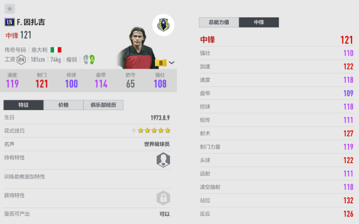 因扎吉被誉为“活在越位线上的男人”,他是意大利06夺冠和米兰07夺冠的主力前锋。“九爷”在场上也许不是最华丽的那个,他总是把自己隐藏起来,关键时刻“致命一击”。此前的多张因扎吉赛季卡,逆足都是3,这影响了他获得机会后的把握效率,赶上左脚的射门不会太准。而LN赛季弥补了这一短板,能让因扎吉的威胁变得更大。他有着教科书般的跑位意识,并不会过多参与到球的推进组织中,只是负责一些简单的串联衔接,二过一后因扎吉的前插很积极。喜欢直塞的玩家,可以尝试在前场打一些小直塞配合,因扎吉启动不错,可以斜向跑动接应。LN因扎吉具有鲜明的特点,在合适的战术下效果很不错,不过想发挥好不容易,需要多感受找到准确用法。以上就是LN赛季逆足加强的部分球员介绍,这里面有没有你喜欢的球星呢,感兴趣的话,赶快到游戏内试一试吧。更多精彩内容,敬请关注EA SPORTS官方公众号。