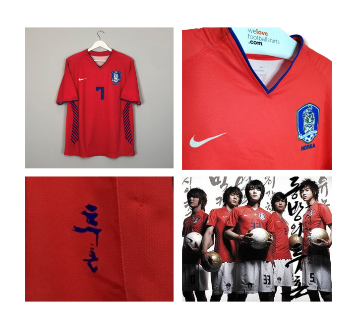 韩国队的球衣在两腋下加入了朝鲜民族的神兽太极虎纹。背部右下方角落出人意料地出现两个韩文文字:斗魂(투혼tuhon)。两字以韩式书法写就,狂野有力,精彩绝伦(之后这两个字经常出现在韩国队的新球衣上)。当年更是邀请到了韩国第一男团东方神起助阵。