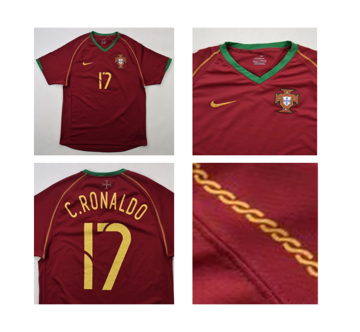 葡萄牙球衣在肩部到腋下的连接处点缀着金色的海船锁链花纹,一枚达伽马十字高挂后领口。这两处特别设计体现了葡萄牙在大航海时代的先驱精神和追逐黄金的梦想。