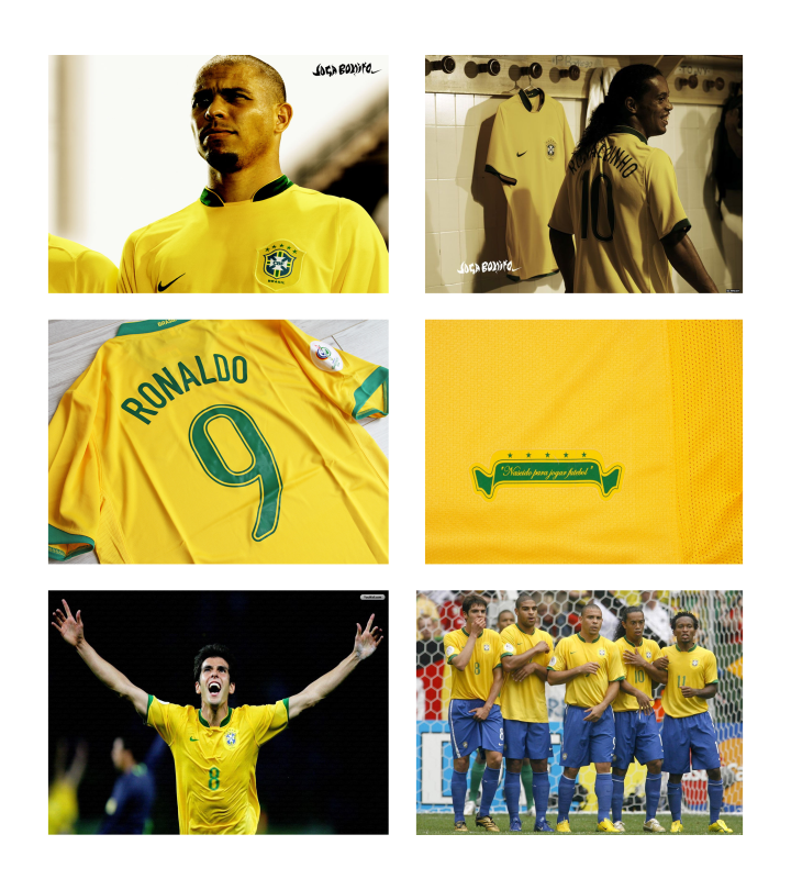 巴西球衣延续了一贯的简单明亮,但一弯优雅的绿色黄边小立领瞬间把整体气质顶上MAX。无论是配搭大小罗的灵动或卡卡的优雅,这件球衣都轻松驾驭。球衣正面右下角,一面体现巴西足球精神的金色横幅闪耀其上:nascido para jogar futebol (生为踢球,born to play the game)。