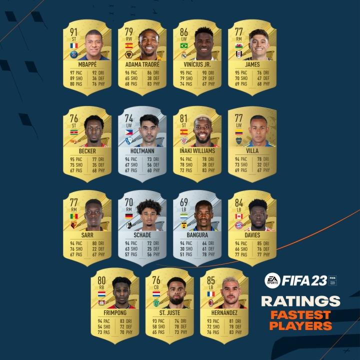 《FIFA 23》官方公布了游戏中速度最快的前15名球员,姆巴佩居首,维尼修斯、阿方索-戴维斯、特奥等人均在列。