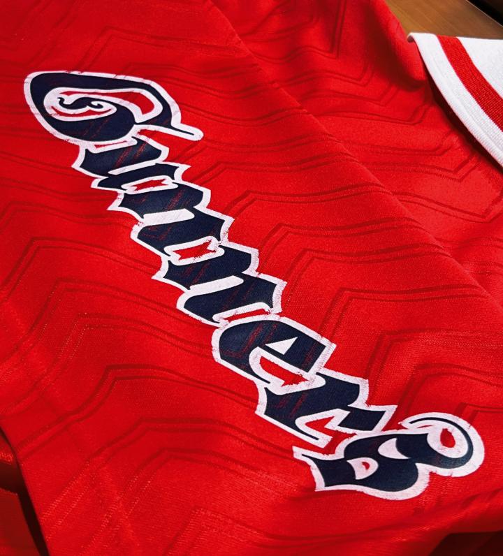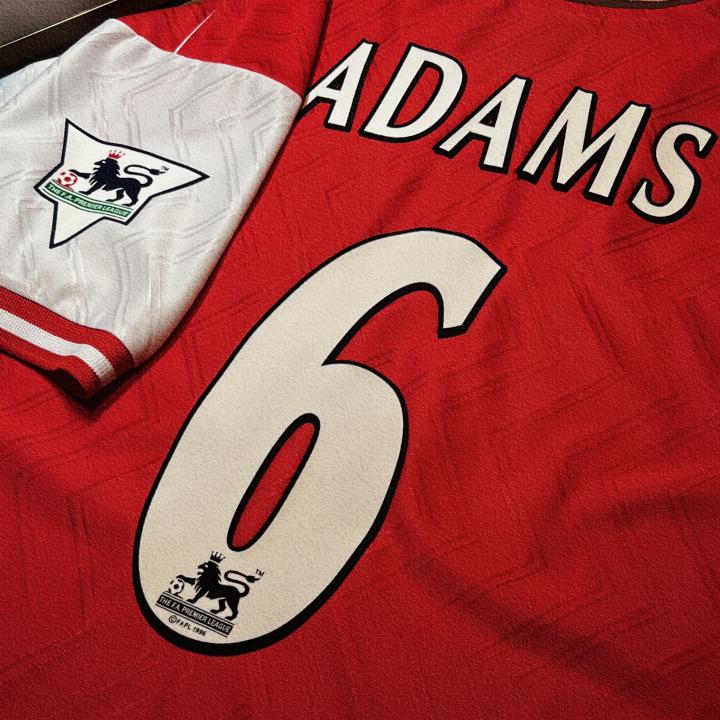 其次来看球衣的背面,首先是植绒的印号,本件球衣印制了阿森纳传奇队长托尼·亚当斯的6号,97/98赛季,31岁的亚当斯正值当打,撑起了阿森纳的后防线。最值得一提的就是球衣背面下摆处哥特式字体的Gunners,不仅呼应了胸前的暗纹,同时也让球衣的背面不仅仅是单调的一个号码。