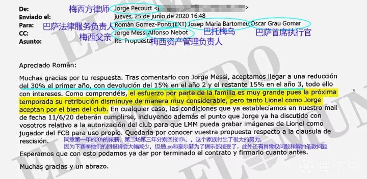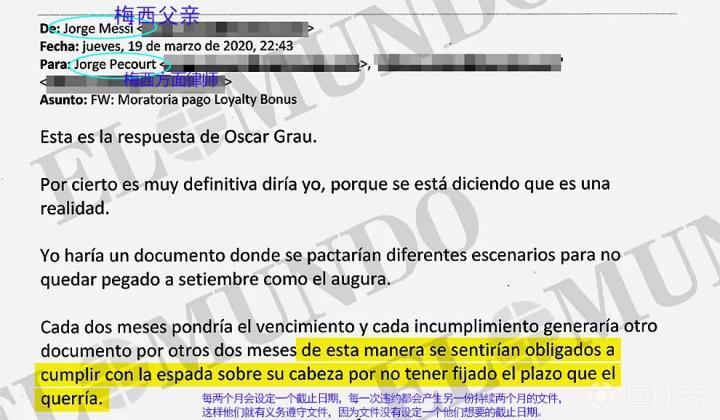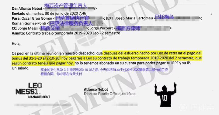 第一封邮件开始于2020年6月11日,下午6点28分,Cuatrecasas的律师Jorge Pecourt给巴托梅乌发了一封电子邮件;俱乐部首席执行官奥斯卡-格劳( Óscar Grau)和法律服务负责人罗曼-戈麦斯-庞蒂( Romàn Gomez-Ponti)将一份副本交给了豪尔赫-梅西和这位足球运动员的“家族资产办公室”负责人阿方索-内博特,其中他详细介绍了续约合同的建议,根据El Mundo在2021年1月31日披露的内容,这意味着巴塞罗那在2017年-2021年间将要花费约合5.5亿欧元(具体数字为555,237,619欧元)。