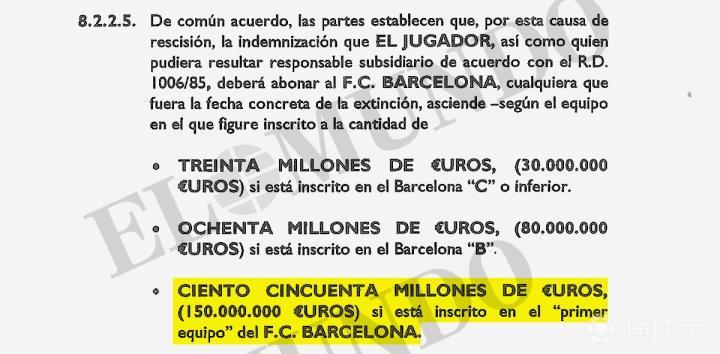 8000万欧元;如果他为巴萨C队效力,那么这个金额就确定为3000万。如果是巴萨决定提前终止合同,将支付给他的赔偿金将在180,304欧元到300,506欧元之间,这又是一个不成比例的滥用违约金条款