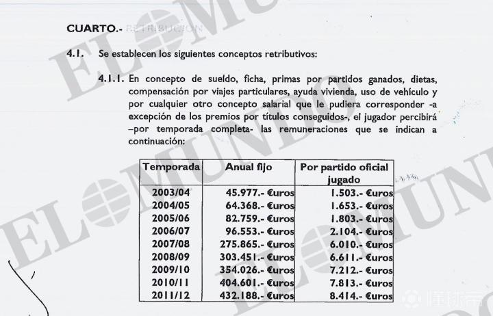与梅西达成协议的同时,他获得的奖金将作为“技术团队的费用”,以帮助球员安排在最合适的位置,决定他参加或不参加正式比赛或友谊赛,调整他的运动需求”。该奖金在2003/04年每年5,109欧元和2011/12年每年48,021欧元之间。反过来,他在第一个赛季的肖像权转化为每年获得9,015欧元,在合同的最后一个赛季中获得84,743欧元。当然,该奖金金额与他在俱乐部一线队的出场有关。“