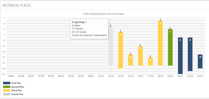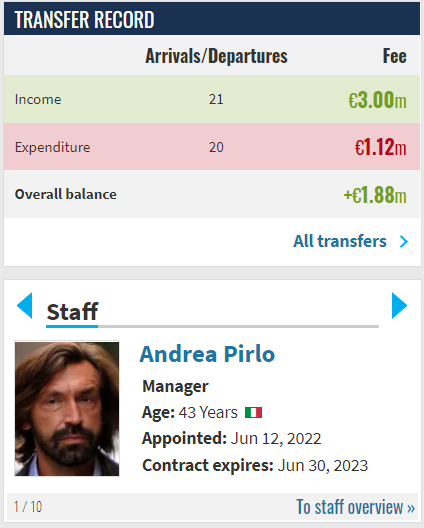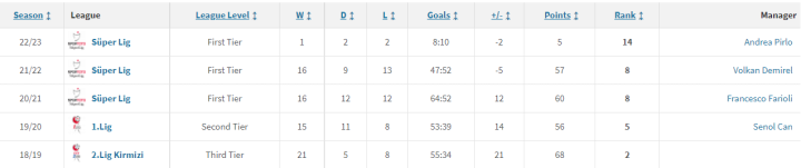 不得不说,得益于老板担任足球总监多年积攒的经验和人脉,在转会费用紧缺的情况下,成绩确实不错。18/19赛季顺利冲甲。19/20赛季,抠门老板就地取材,提拔时任助理教练Senol Can担任主教练,哪知道场均拿到1.5分,以第五的成绩顺利升至土超。20/21赛季,看上守门员教练意大利人Farioli,让他担任从没接触过的主教练一职。结果以黑马姿态位居土超第8。热爱菜鸟的抠门老板再次解雇Farioli,挖来费内巴切助理教练Demirel,21/22土超二年继续位居联赛第8。是时候让主教练了离开了,此时的抠门老板看上球员生涯完美的皮尔洛,指望皮尔洛在短短的一年合同期间让卡拉古鲁克圆梦欧战,并赚足人气。