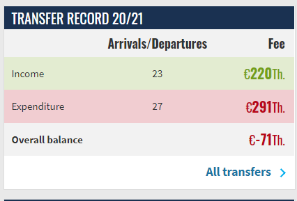 20/21赛季,也就是卡拉古鲁克第一个土超赛季,德转数据显示球队转会支出29.1万欧,转会收入22万欧。作为升班马,第一个赛季不为保级掏钱引援,反而节衣缩食,掏出皱巴巴的一点银两。本赛季完美结束,成功进入上半区之后,抠门老板以为玩土超根本不用花钱,21/22赛季变本加厉,一分钱不给,靠自由球员和租借凑数。